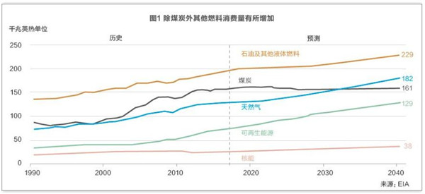 各機(jī)構(gòu)預(yù)測,向更低碳的能源結(jié)構(gòu)轉(zhuǎn)型將會持續(xù)。EIA認(rèn)為,到2040年,世界范圍內(nèi),除煤炭外其他燃料消費(fèi)量均呈增加態(tài)勢。BNEF預(yù)測,2017年至2050年期間,全球發(fā)電行業(yè)的煤炭消費(fèi)量將下降56%。BP指出,可再生能源的持續(xù)快速增長正在導(dǎo)致有史以來最多元化的能源結(jié)構(gòu),2040年,石油、天然氣、煤炭和非化石能源預(yù)計將各提供世界能源的約四分之一,超過40%的能源需求增長將來自可再生能源。