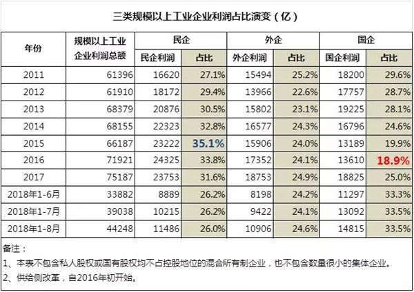 注意上表中的三列占比演變數(shù)據(jù)。規(guī)模以上工業(yè)企業(yè)中,民企的利潤占比從2011年到2015年呈現(xiàn)持續(xù)上升趨勢,從27.1%上升到峰值的35.1%,然后,伴隨著供給側(cè)改革的實施,民企的利潤占比持續(xù)下降,到2018年8月份下降到26.0%。外企的利潤占比始終穩(wěn)定在24%左右。而國企的利潤占比演變規(guī)律則與民企剛好相反。從2011年的29.6%,下降到2016年的18.9%,此后伴隨著供給側(cè)改革,國企的利潤占比迅速提升,到2018年8月份提升到33.5%。從這個角度上看,供給側(cè)改革的核心意義,就是以原材料漲價為核心手段提升相應(yīng)國有企業(yè)的利潤,并減少民企的利潤,也就是生產(chǎn)領(lǐng)域的利潤再分配。