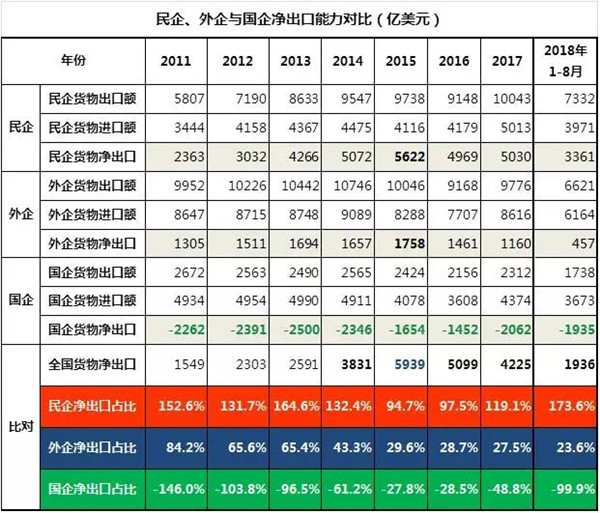整體而言,2011年至2018年8月,民企的凈出口規(guī)模合計38978億美元,外企合計11818億美元,而國企的數(shù)據(jù)令人大開眼界,合計-19717億美元。我建議各位再認真的一個字一個字的讀一下這個數(shù)據(jù):-19717億美元。然后我們再來好好思考一下:國企能不能建立起出口能力?如果國企最終無法建立出口能力,那么,國企還能干什么?