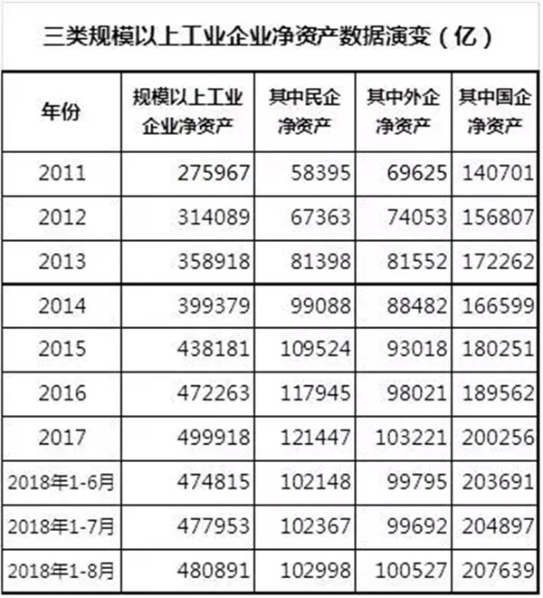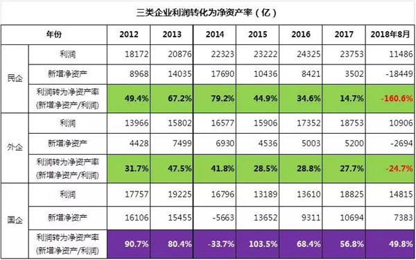我們首先來看民企。民企的利潤轉(zhuǎn)為凈資產(chǎn)率,從2012年到2014年還呈現(xiàn)上升態(tài)勢,從49.4%提升到79.2%。這其實是非常不錯的數(shù)據(jù)演變規(guī)律,照這么下去,民營企業(yè)家們維持著越來越旺盛的再投資熱情,必將會承擔起更大的經(jīng)濟發(fā)展責任。但此后形勢突然逆轉(zhuǎn),到2015年就下降到了44.9%,到2017年已經(jīng)下降到14.7%,再到今年1-8月份,規(guī)模以上民營工業(yè)企業(yè)掙了1.15萬億的利潤,但是其凈資產(chǎn)規(guī)模相對2017年底居然整體下降了1.84萬億(480891億-499918億)。這種凈資產(chǎn)規(guī)模下降,只能解釋為有大量的企業(yè)家選擇減產(chǎn)乃至是停產(chǎn),從“規(guī)模以上”這個總盤子里消失了。企業(yè)家們集體主動或被動選擇了這個危險的方向,導致今年1-8月份的凈資產(chǎn)轉(zhuǎn)化率變成了一個負值,并且數(shù)值極大:-160.6%。