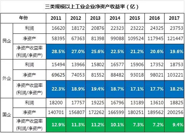 總利潤÷凈資產(chǎn),就能得出一個很有意義的數(shù)據(jù):凈資產(chǎn)收益率。這個數(shù)據(jù)乃是反映企業(yè)經(jīng)營效率的核心數(shù)據(jù)。通過比較民企、外企和國企的凈資產(chǎn)收益率情況,我們就能清晰的知道,到底誰掙錢的能力更強。所以下表就是本文放出來的第一個大招。注意,本文后面還有兩個大招,各位在看完下表后不要急著抨擊某戰(zhàn)五渣,因為后面還會有更加震撼的數(shù)據(jù)。