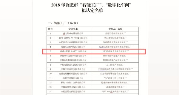 近日,合肥市經(jīng)濟和信息化委員會網(wǎng)站公示了2018年合肥市“智能工廠”、“數(shù)字化車間”擬認(rèn)定名單,通威太陽能(合肥)有限公司“太陽能電池片及組件智能工廠”榮列公示榜單,展現(xiàn)了公司在信息化和智能制造技術(shù)方面的高效應(yīng)用,同時也是對公司取得的自動化、信息化、智能化成果的充分肯定。