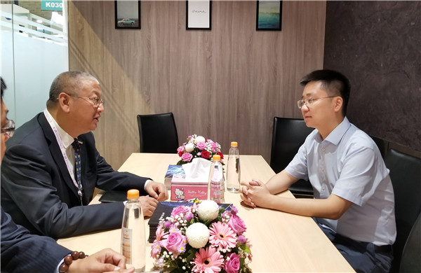 在通威太陽能展臺,謝毅董事長還與隆基綠能科技股份有限公司總裁李振國、榮德新能源副董事長何培林等多位蒞臨嘉賓進行了交流座談。