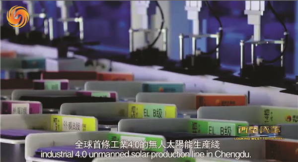 《西望成都》節(jié)目重點(diǎn)展現(xiàn)了通威太陽能無人產(chǎn)線,并指出,在生產(chǎn)領(lǐng)域,成都已經(jīng)布局了堪稱“超級(jí)工廠”的通威太陽能無人生產(chǎn)線——世界首條工業(yè)4.0“智能制造”高效電池生產(chǎn)線。在這座“超級(jí)工廠”里,沒有操作工人忙碌的身影,只有兩三位工程師進(jìn)行著設(shè)備調(diào)試,只有車間里的自動(dòng)化、智能化設(shè)備及數(shù)量極少的工程師。