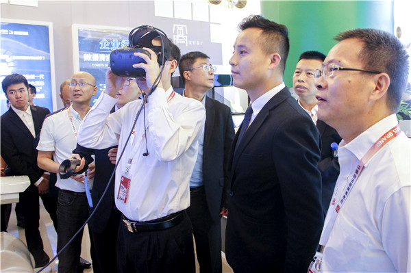 四川省質監局副局長周傳軍、四川省博覽事務局局長楊慶龍通過VR了解通威集團新能源產業鏈