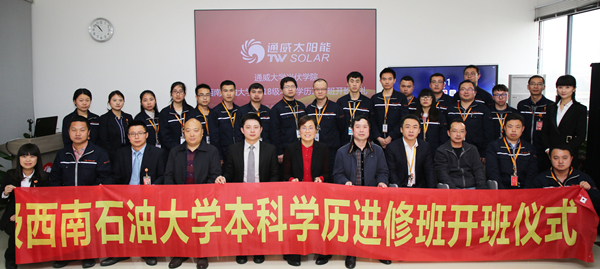 3月16日,通威大學(xué)光伏學(xué)院2018級(jí)本科學(xué)歷進(jìn)修班開(kāi)班典禮于通威太陽(yáng)能成都公司隆重舉行,西南石油大學(xué)繼續(xù)教育學(xué)院副院長(zhǎng)阮雪梅、招生辦公室主任史永剛、教務(wù)辦公室主任蒲建、班主任老師胥章建,通威太陽(yáng)能人力資源總監(jiān)楊文棟以及公司中干團(tuán)隊(duì)出席開(kāi)班典禮并共同見(jiàn)證學(xué)員勤奮好學(xué)宣誓儀式。