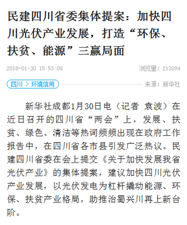 近日召開的四川省“兩會(huì)”上,民建四川省委集體提交了一份《關(guān)于加快發(fā)展我省光伏產(chǎn)業(yè)的提案》。提案建議,加快推進(jìn)光伏產(chǎn)業(yè)發(fā)展,不僅可改善霧霾問題,還可結(jié)合我省先天資源稟賦和優(yōu)越地理特點(diǎn),率先在全國走出一條以水電和光伏發(fā)電作為主要能源供應(yīng)的清潔發(fā)展之路。該提案引發(fā)社會(huì)各界廣泛熱議,并受到主流媒體的強(qiáng)烈關(guān)注,新華社刊出《民建四川省委集體提案:加快四川光伏產(chǎn)業(yè)發(fā)展,打造“環(huán)保、扶貧、能源”三贏局面》的報(bào)道文章,閱讀量突破24萬,關(guān)注熱度還在持續(xù)增長。