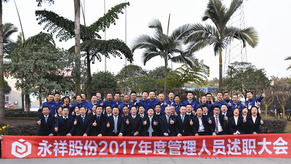 1月19日,永祥股份成功舉行2017年管理干部述職大會,永祥股份各公司總經理助理、股份經理以上共17名人員進行了述職。通威股份董事、永祥股份董事長兼總經理段雍,永祥股份財務總監周斌,永祥股份副總經理、永祥新能源總經理李斌,永祥股份副總經理、永祥樹脂執行總經理周宗華,永祥多晶硅執行總經理袁中華,永祥股份副總經理、永祥多晶硅副總經理禚東舉,永祥水泥總經理杜炳勝出席會議,永祥各子公司部門負責人參加會議。