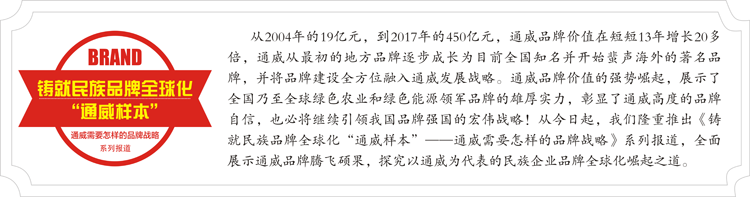 基業長青,品牌先行。品牌建設緊緊圍繞集團雙主業快速騰飛的大趨勢,此為取勢;清晰制訂系統性、規范性、專業性的品牌規劃與戰略路徑,此為明道;而在有效促進企業生產經營同時,有效促進通威品牌形象、品牌知名度和產品美譽度的不斷強化,不斷創新管理和建設工作的方式方法,此即為優術。在集團雙主業不斷做強做大的同時,通威品牌戰略通過取勢、明道、優術,持續提升品牌的市場價值與市場影響力,將為通威的長期戰略發展提供堅實、有力、可靠的重大支撐!
