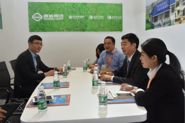 通威集團禚玉嬌總裁與永祥股份財務總監(jiān)周斌在通威展臺交流