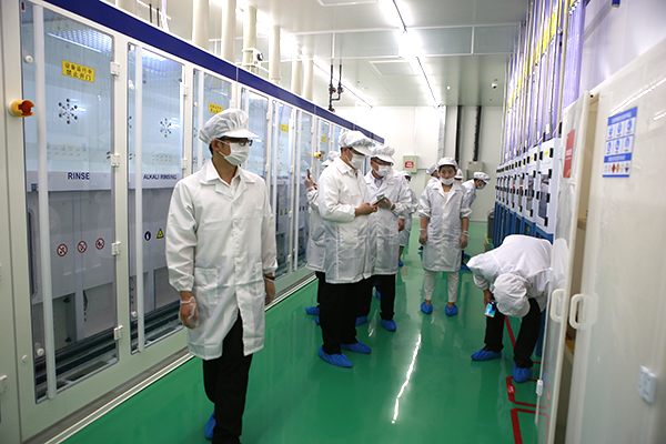在項目自查會前,參會人員被分為四個小組,在通威太陽能(成都)有限公司的組織下深入雙流5GW高效晶硅電池項目現場,認真看細節、查問題。