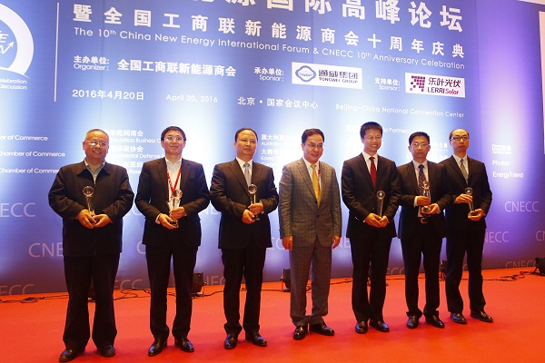 2016年恰逢《中國可再生能源法》頒布十周年,也是全國工商聯(lián)新能源商會(huì)成立的十周年,為此,論壇評(píng)選出了“中華新能源十年名人獎(jiǎng)”、“中華新能源十年貢獻(xiàn)獎(jiǎng)”等重磅獎(jiǎng)項(xiàng)。通威集團(tuán)董事局劉漢元主席榮獲“中華新能源十年名人獎(jiǎng)”、通威集團(tuán)榮獲“中華新能源十年貢獻(xiàn)獎(jiǎng)”,禚玉嬌總裁代表集團(tuán)上臺(tái)領(lǐng)獎(jiǎng)。