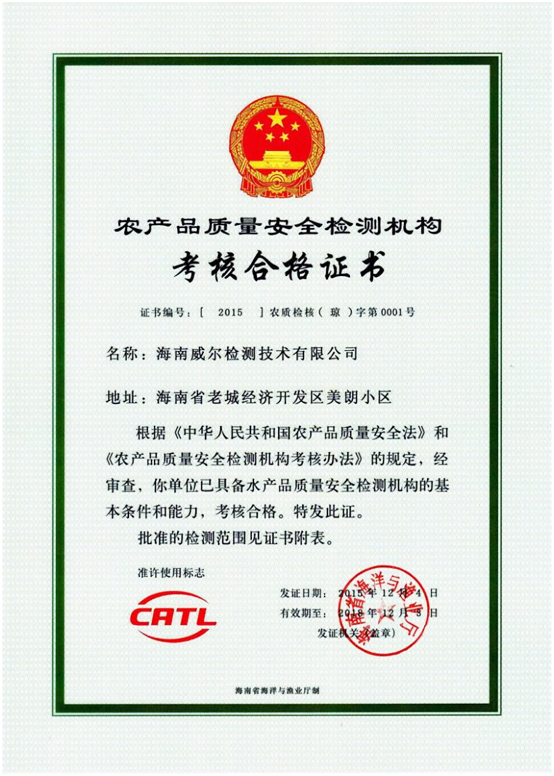 目前,海南威爾檢測已取得了CNAS(國家認可委實驗室認可)、CMA(計量認證)、CMAF(食品檢驗機構資質認定)、CATL等證書,成為海南省資質最全的第三方檢測公司。