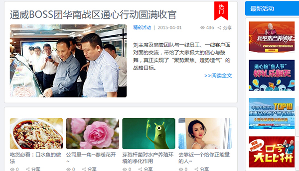 2015年3月29日-4月2日,經(jīng)過(guò)了近萬(wàn)公里的長(zhǎng)途奔波和五天四夜不間斷的全程直播,此次通威BOSS團(tuán)華南戰(zhàn)區(qū)“通心”行動(dòng)暨通心粉社區(qū)移動(dòng)直播活動(dòng)圓滿(mǎn)收官。截至4月2日上午9時(shí)30分,通心粉社區(qū)直播活動(dòng)共計(jì)發(fā)帖60余篇,閱讀量超30000次,回復(fù)近20000條。除了通心粉社區(qū)全程直播外,集團(tuán)官網(wǎng)、股份官網(wǎng)、集團(tuán)微信企業(yè)號(hào)、集團(tuán)微信訂閱號(hào)、第一水產(chǎn)微信訂閱號(hào)、新浪微博、騰訊微博等線(xiàn)上平臺(tái)同步直播。